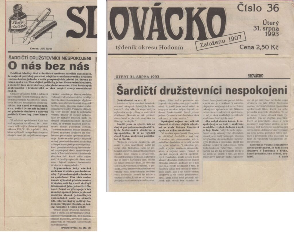 „Poklidné hladiny dění v Šardicích nedávno rozvířila skutečnost, že majetek potřebný pro chod zdejšího transformovaného družstva – mimochodem jednoho z mála prosperujících, přešel 28. června do rukou spol. s r.o. Klas. Jejími podílníky je šest členů vedení družstva, z nichž tři jsou zároveň členy jeho představenstva,” píše se v úvodu článku s výstižným titulkem: O nás bez nás.